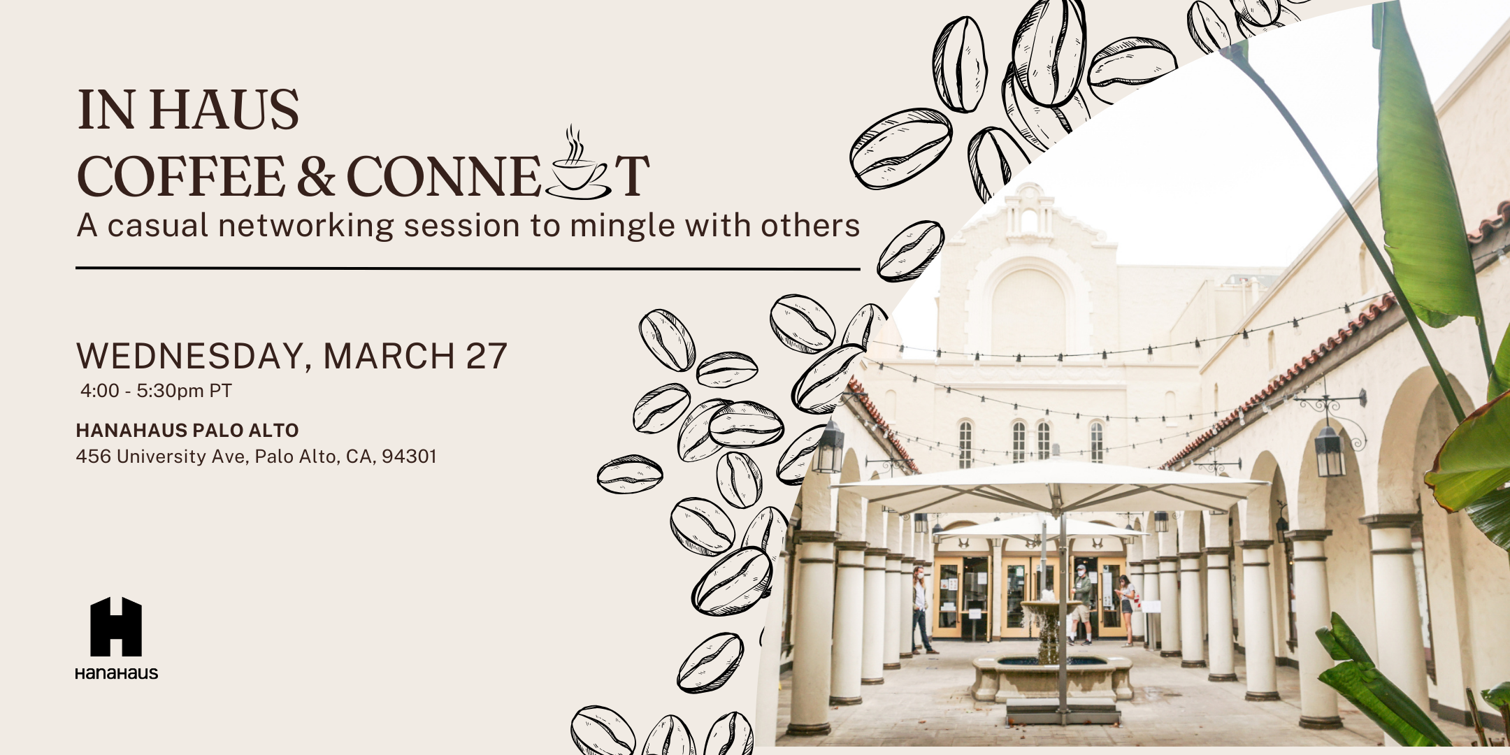 HanaHaus (map) 456 University Avenue Palo Alto, CA, 94301 United States ✚ gCal ✚ iCal Attend a casual networking session at HanaHaus Palo Alto to connect with others. This is a free community event, however space is limited so please register below. Register here