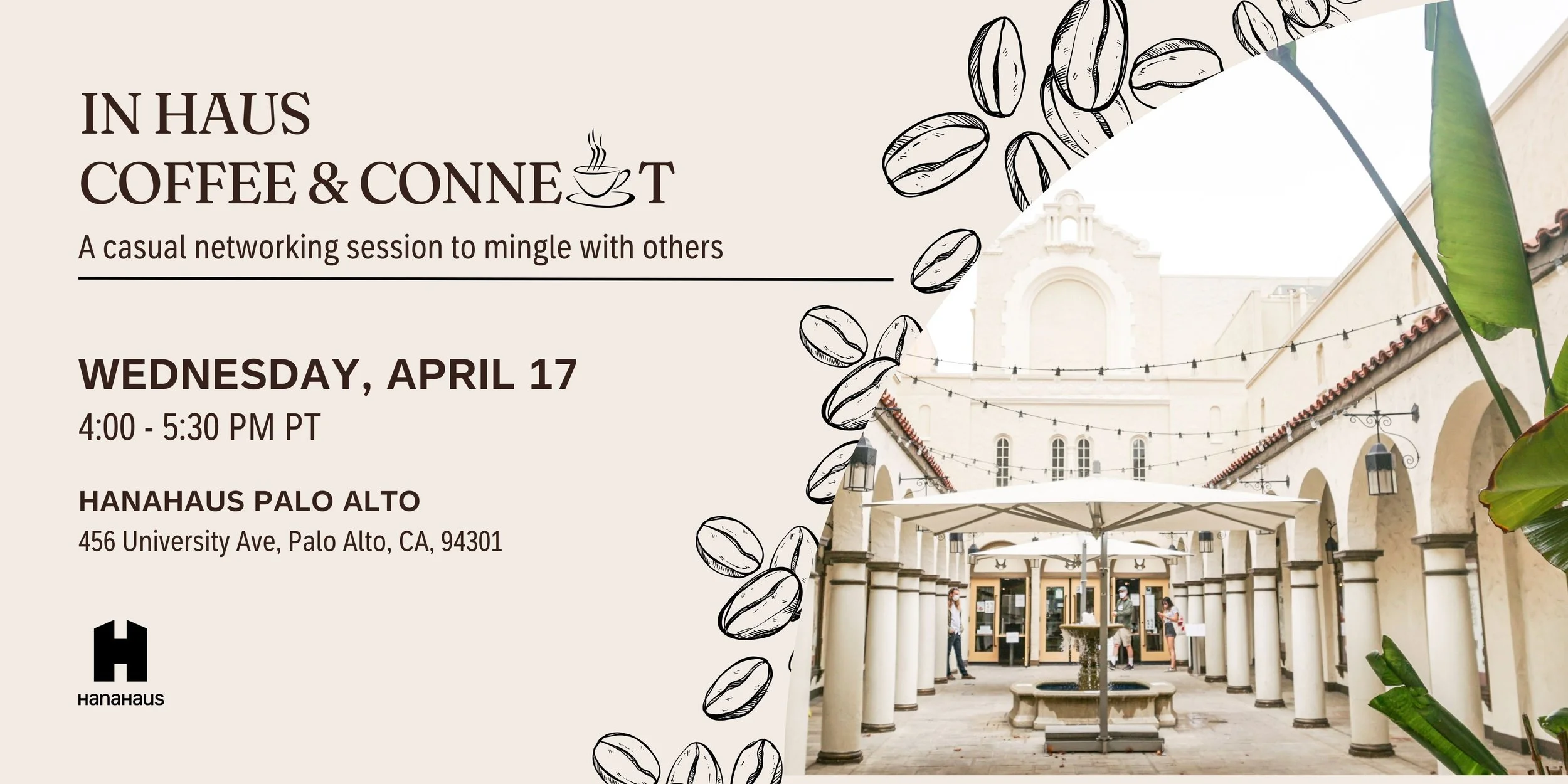 HanaHaus (map) 456 University Avenue Palo Alto, CA, 94301 United States ✚ gCal ✚ iCal Attend a casual networking session at HanaHaus Palo Alto to connect with others. This is a free community event, however space is limited so please register below. Register here