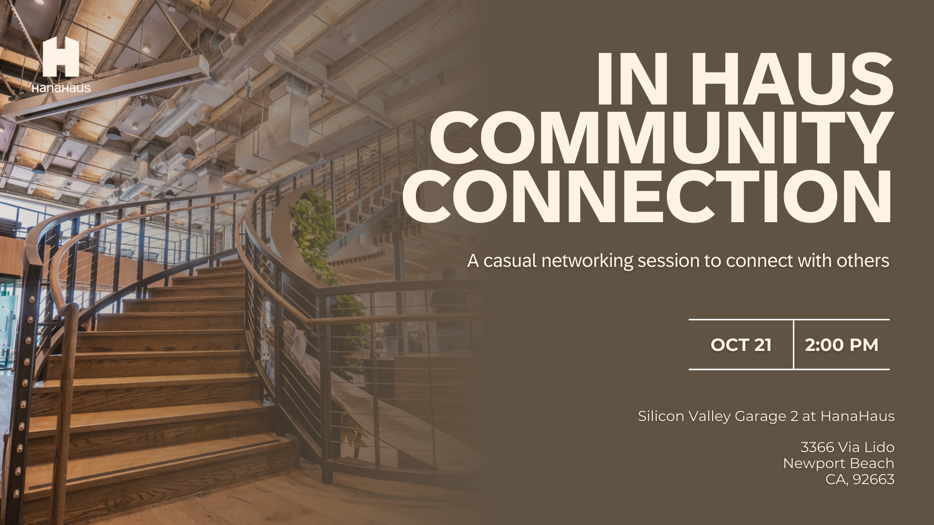 Join us for our upcoming In Haus Community Connection; an informal networking opportunity at HanaHaus. Immerse yourself in the vibrant atmosphere as you mix and mingle with others.